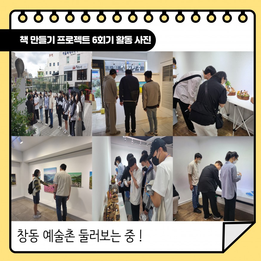 [발달장애 전문도서관사업] 함께 보고(go), 즐기고(go) 장벽없는 우리들의 이야기 '책 만들기 프로젝트' 6회기 작성자 관리자 댓글 0건 조회 1,433회 작성일 23-05-22 15:00 [주최 : 경상남도, 주관 : 경상남도평생교육진흥원, 시행 : 창원발달장애인가활센터]함께 보고(go) 즐기고(go) 장벽 없는 우리들의 이야기 '책 만들기 프로젝트 '6회기'를 5월 19일 (금) 진행 하였습니다!6회기는 마산 창동 예술촌 탐방을 진행 하였으며, 경남대학교 학생과 발달장애인 청년이 함께 활동을 하였습니다창동 예술촌을 둘러보면서 함께 역사와 작품에 대해 이야기를 나눌 수 있게 되었으며, 조금 더 가까워지는 시간이 되었습니다‼앞으로의 우리들의 이야기도 많은 관심 부탁드립니다 목록 이전글[발달장애 지역사회공존사업] 'For 우리' 지역사회봉사단 3회기 23.05.22 다음글[장애공감 홍보사업] 장애공감가게 홍보 캠페인 23.05.17 댓글목록 등록된 댓글이 없습니다.