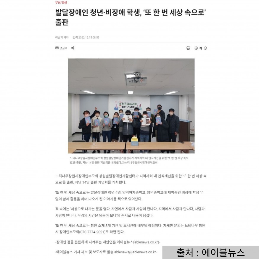 [발달장애 전문도서관사업]또 한 번 세상속으로 출판 기념회 언론사 보도 작성자 관리자 댓글 0건 조회 1,674회 작성일 22-12-20 11:38 지난 12월 14일 (수) 진행한 "또 한 번 세상속으로" 출판 기념회가 언론에 소개 되었습니다.또 한 번 세상속으로 책 출판 기념회에 대해 소개 해주신 에이블뉴스, 경남도민일보, 경남일보, 경남신문 감사드립니다.또 한 번 세상속으로 책 많은 관심 부탁드립니다. 목록 이전글[장애공감 홍보사업] 지역사회봉사단 이름 짓기 SNS 이벤트 당첨자 발표 23.02.27 다음글[2022 장애인일자리사업] 찾아가는 장애 이해교육 with 꿈나무 지역 아동센터 22.12.19 댓글목록 등록된 댓글이 없습니다.